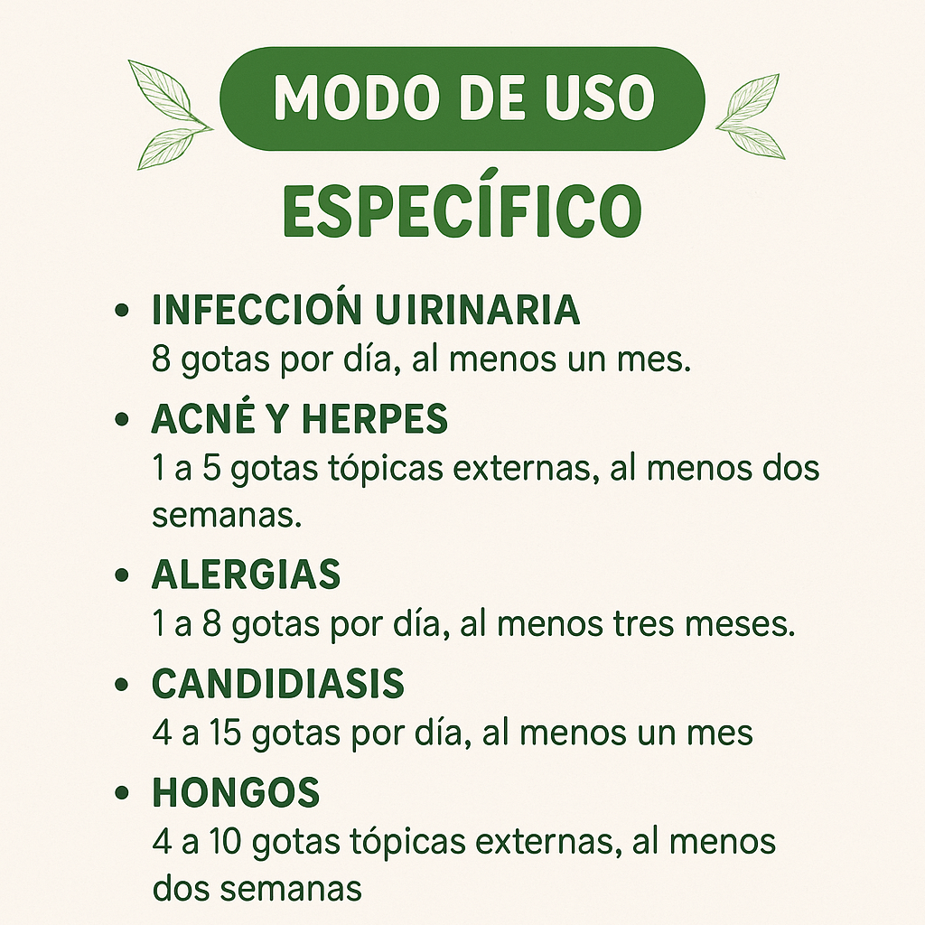 La dosis recomendada es de 2 a 3 gotas al día, diluidas en un poco de agua o miel.